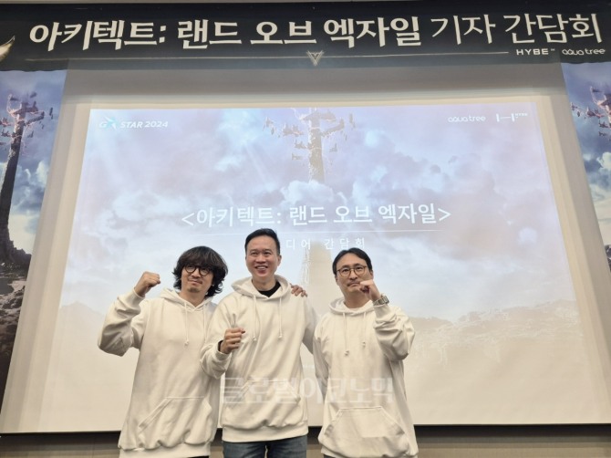 이미지 확대보기'아키텍트: 랜드 오브 엑자일' Q&A. (좌측부터)정우용 하이브IM 대표, 박범진 아쿠아트리 대표와 김민규 하이브IM 실장. 사진=편슬기 기자