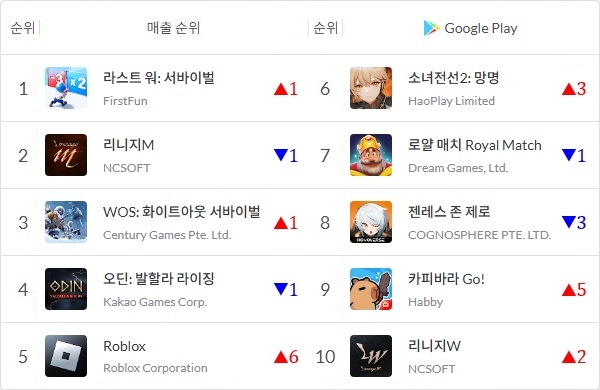 엔씨소프트의 '리니지M'과 퍼스트펀 '라스트 워: 서바이벌'이 1위 자리를 두고 순위 다툼을 개시했다. 선본 네트워크의 '소녀전선2: 망명'은 이달 초 출시 후 3주 연속 매출 톱10 자리를 지켰다.