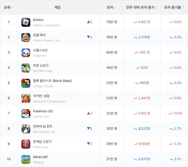 아이지에이웍스가 운영하는 앱 통계 분석 플랫폼 모바일인덱스에 따르면 로블록스는 2월 4주차(24일~3월 2일) 기준 구글 플레이 WAU 79만2927명을 기록했다. 이로서 2월 첫주차 이후 3주 만에 1위 자리에 복귀했다.