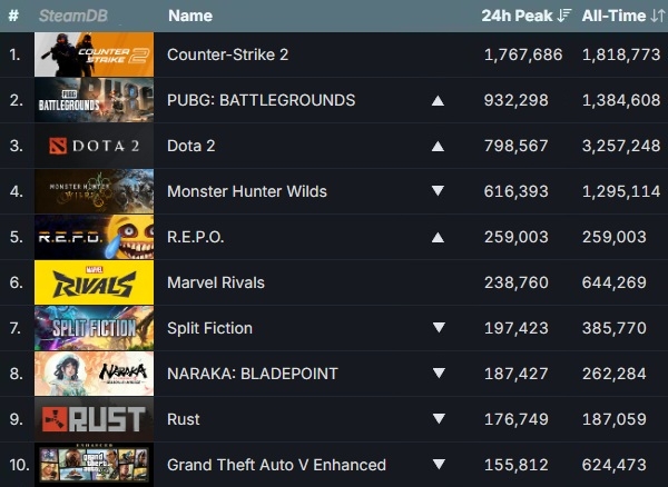 동시 접속자 수 최상위권을 살펴보면 캡콤의 2월 28일 신작 '몬스터 헌터 와일즈', EA의 3월 7일 신작 '스플릿 픽션'이 지속 흥행하는 가운데 스웨덴 인디 게임사 세미워크의 '레포(R.E.P.O.)'가 새로이 5위에 올랐다.