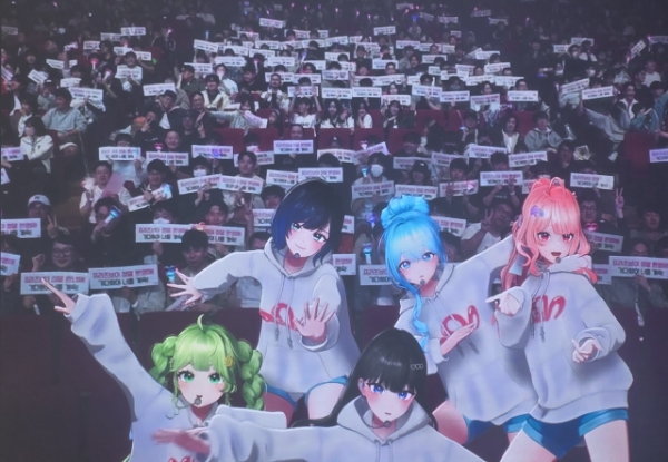 이미지 확대보기연세대학교 대강당에서 5월 3일 버추얼 아이돌 유닛 프리즈V의 첫 오프라인 콘서트 '하이파이브'가 진행됐다. 콘서트 말미에 프리즈V 멤버들이 기념 촬영을 하고 있다. 사진=버추얼휴먼산업협회