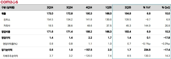 지난해 2분기 대비 매출 28%가 줄었으며 영업손실 40억 원, 순손실 61억 원 대비 적자가 유지됐다. 직전 분기인 올 1분기와 비교하면 매출 12.4%가 늘었으나 영업손실 32억 원, 순손실 66억 원 대비 적자가 유지된 실적이다.