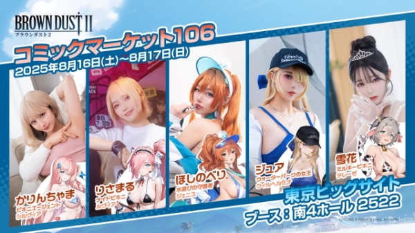 이미지 확대보기네오위즈가 오는 8월 16일 일본 도쿄 빅사이트에서 열리는 제106회 코믹마켓에 참여한다. 네오위즈 부스에 함께하는 코스프레 모델들. 캐릭터는 왼쪽부터 실비아·루비아·제니스·빌헬미나·테레제. 사진=네오위즈