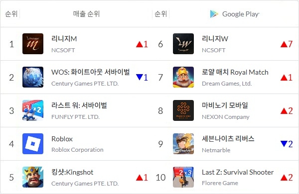 엔씨소프트 '리니지M'이 지난주 'WOS'에 내줬던 1위 자리를 탈환한 가운데 엔씨의 또 다른 MMORPG '리니지W' 또한 구글 매출 6위까지 치고 올라왔다.