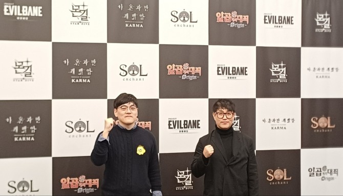 최동수 넷마블몬스터 '프로젝트 이블베인(가칭)' 기획팀장(왼쪽)과 이정호 넷마블 사업본부장이 지스타 2025 미디어 인터뷰를 앞두고 기념 촬영을 하고 있다. 사진=이원용 기자
