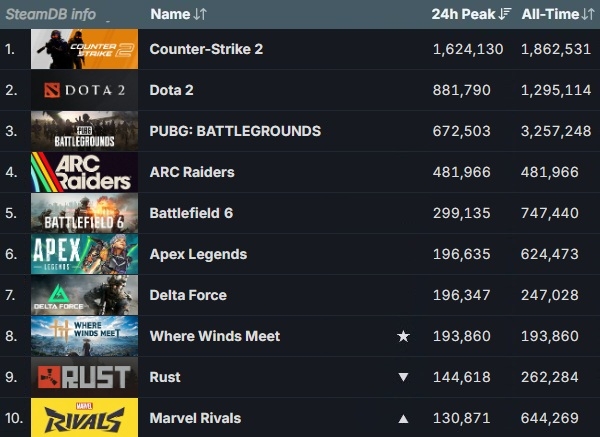 2025년 11월 16일 기준 스팀 게임들의 최다 동시 접속자 순위, 화살표는 9일 대비 순위 변동을 나타낸 것. 별표는 한 주 동안 출시된 신작. 사진=스팀 데이터베이스