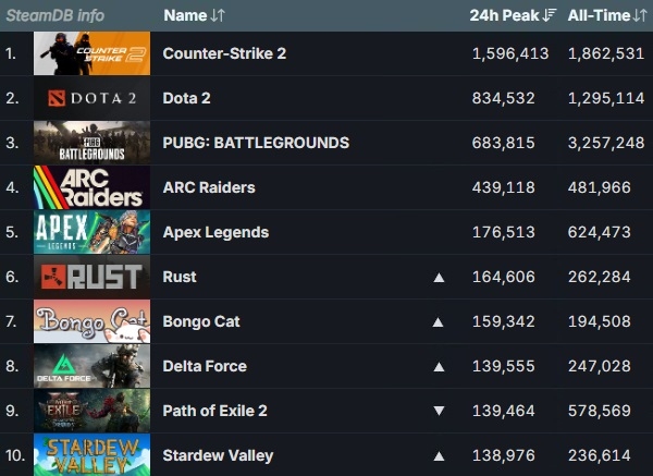 밸브 코퍼레이션의 '카운터스트라이크2'와 '도타2', 크래프톤 '펍지: 배틀그라운드' 등 만년 톱3가 제 자리를 지킨 것은 물론 넥슨 '아크 레이더스'도 8주 연속 제 자리를 지켰다.